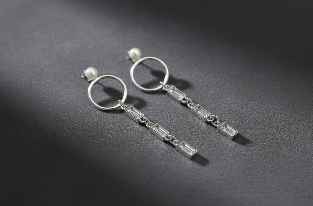 گوشواره مرواریدی نقره ای آویز نگین باگتی